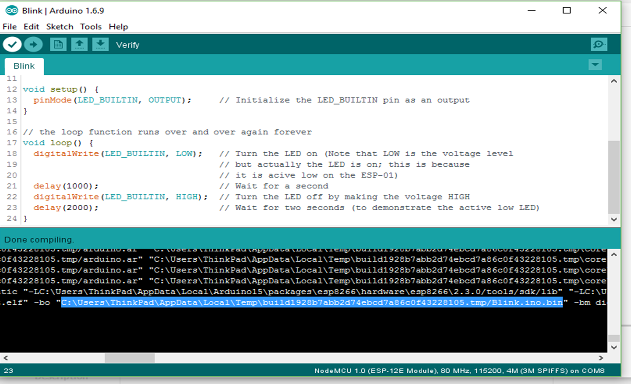 1 เขียนโค้ดในโปรแกรม arduino เสร็จแล้วคลิกที่ Verify เสร็จแล้วสังเกตที่ช่องข้อความ ค้นหาตำแหน่งที่เก็บไฟล์ .bin